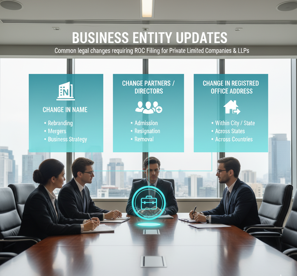 Every business entity—whether a Private Limited Company or a Limited Liability Partnership (LLP)—may need to update its legal details over time. Common changes include:
