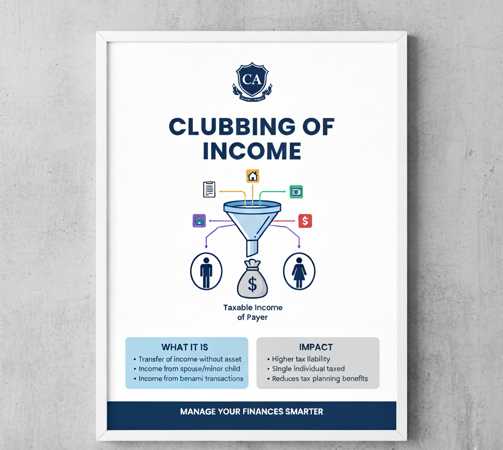 Clubbing of Income refers to situations where the income of another person is added to (clubbed with) your own income and taxed in your hands, as per the Income Tax Act, 1961. Normally, you are taxed only on income earned by you. However, in certain cases – such as income of your spouse, minor child, or assets transferred without adequate consideration – the law requires that such income be taxed in your hands.